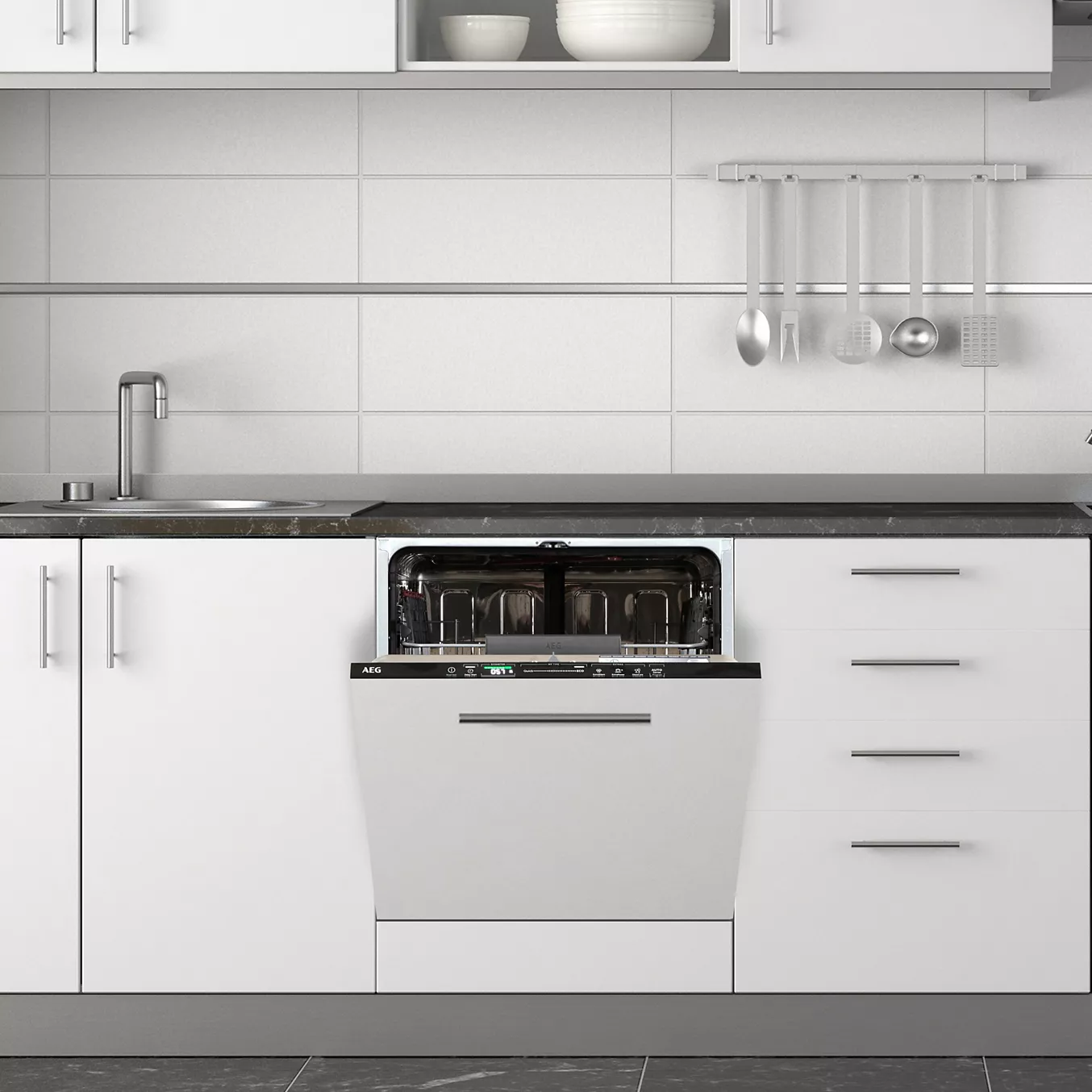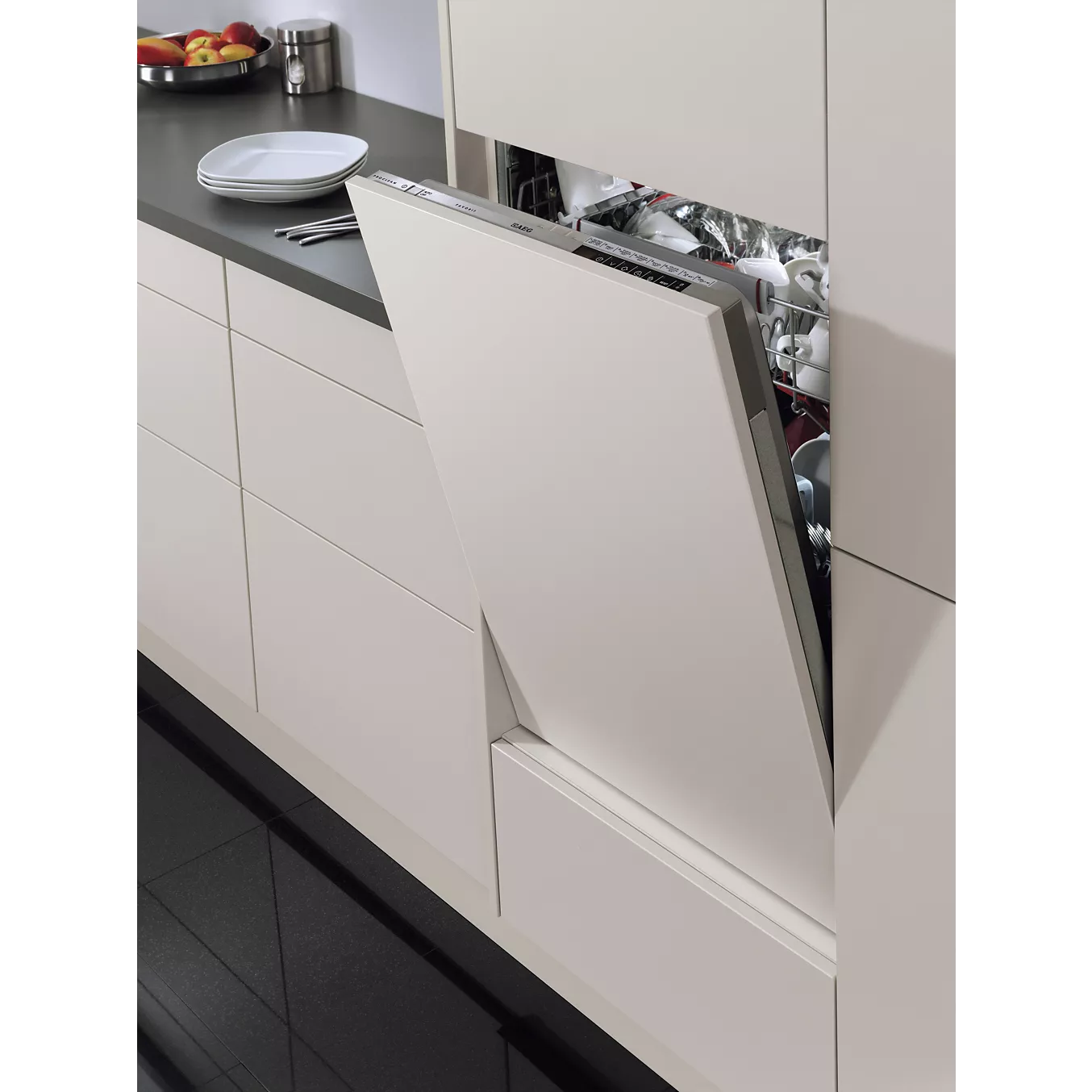 De AEG FSE63657P Silence is een zeer stille volledig geïntegreerde vaatwasser met automatische deuropening voor optimale droogresultaten. Dankzij de vloerprojectie, glasbescherming en efficiënte inductiemotor is dit toestel perfect voor wie comfort, discretie en betrouwbaarheid zoekt in een moderne keuken.