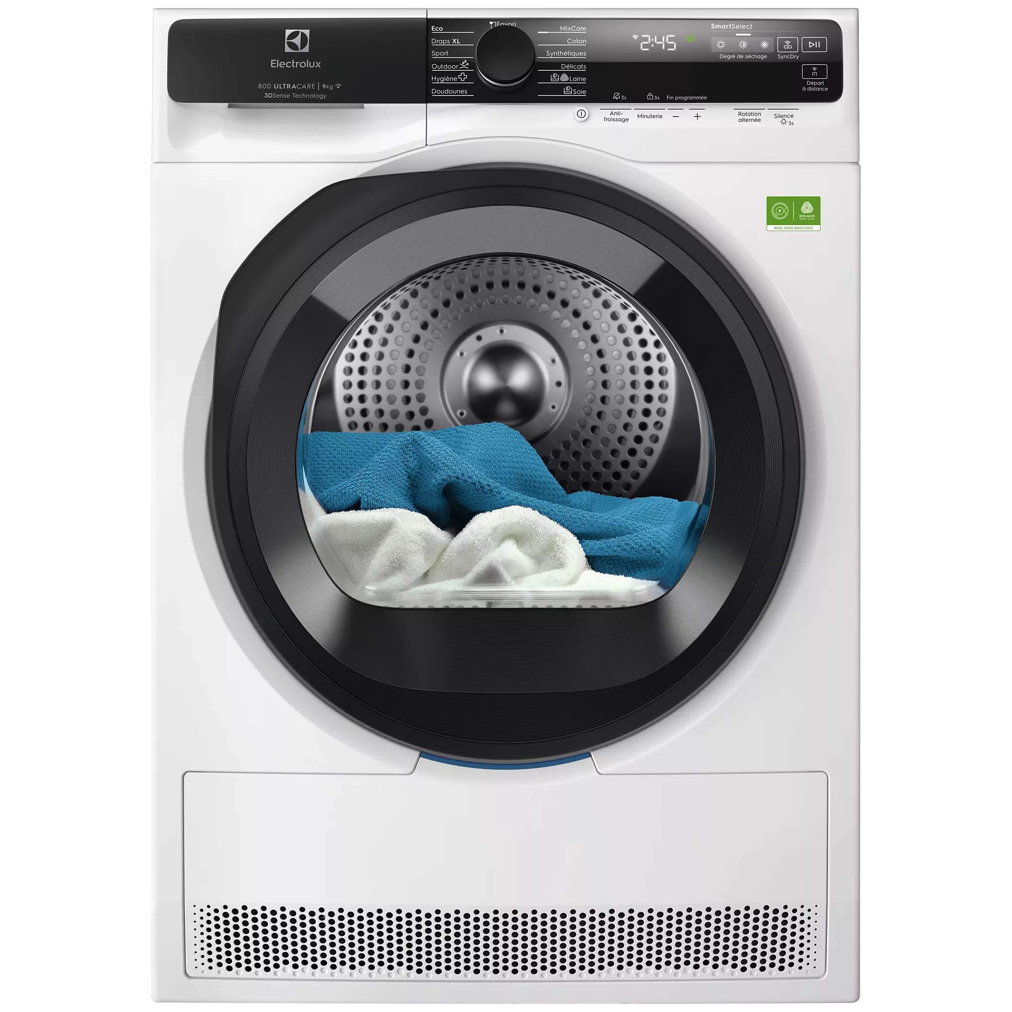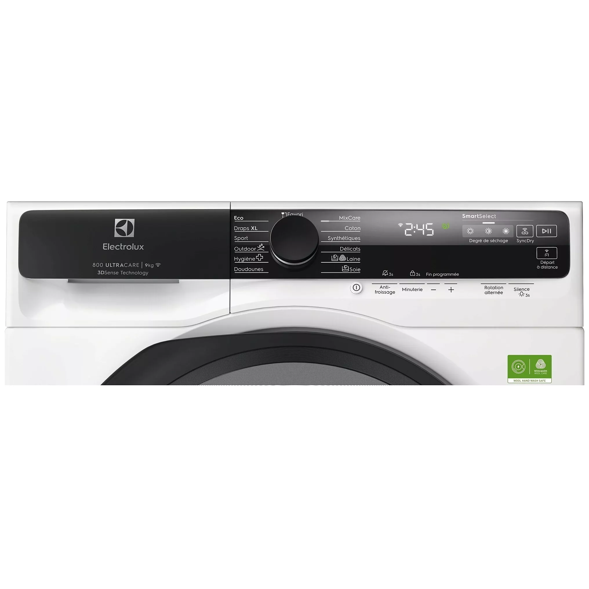 - Programma’s: Gemengde lading, katoen, delicate was, donsjassen, lakens, eco, wol, synthetisch, klaar om op te bergen