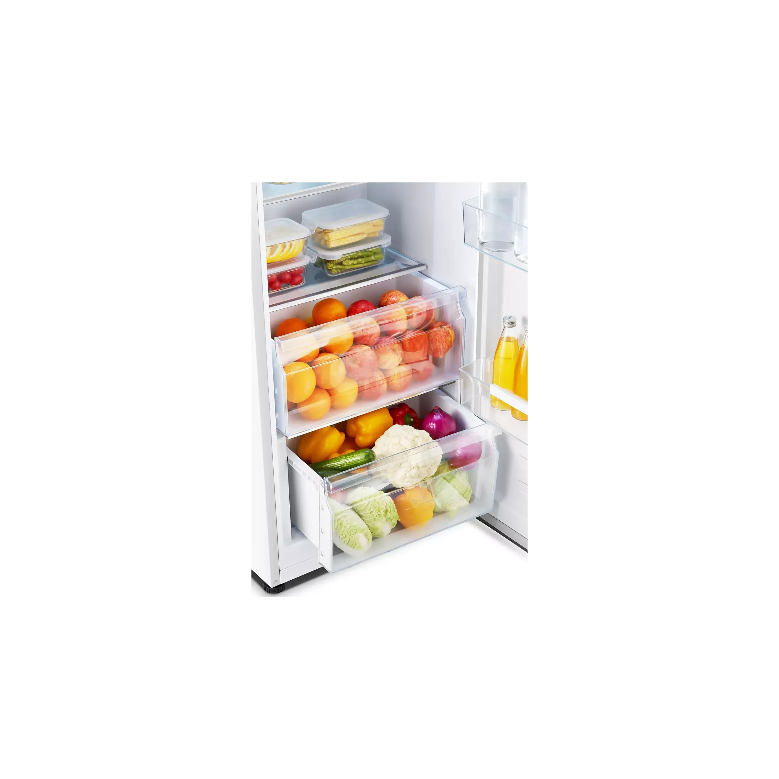 De koelkast beschikt over elektronische temperatuurregeling, een vakantiemodus, deur-alarm en een LED-binnenverlichting voor extra comfort. De inverter compressor zorgt voor een stille en energiezuinige werking. Met verstelbare leggers en ruime groentelades is deze koelkast praktisch en overzichtelijk in gebruik.