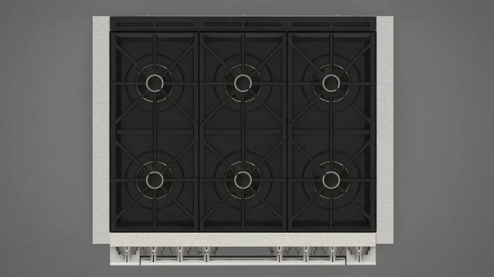 De professionele kookplaat is uitgerust met 6 flexibele Crescendo Dual messing gasbranders, robuuste doorlopende gietijzeren pannendragers en een kuip met speciale mat zwarte emaillelaag voor duurzaamheid en eenvoudige reiniging.
