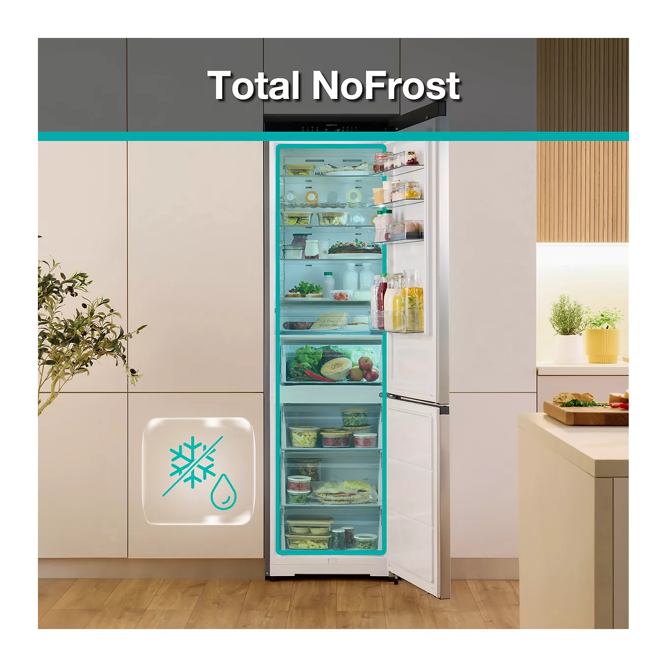 Deze vrijstaande koel-vriescombinatie met vriezer onderaan biedt een ruime totale inhoud van 413 liter en werkt uiterst stil (34 dB). Dankzij No Frost ventilatiekoeling en Multi Air Flow blijft de temperatuur overal gelijk en is ontdooien niet nodig.