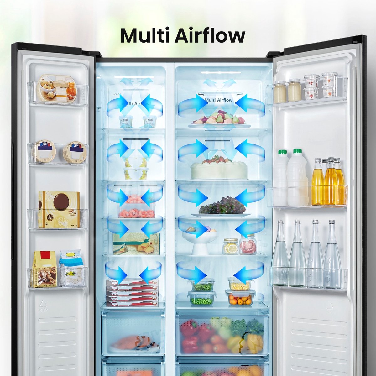 Meerdere luchtventilatoren zorgen ervoor dat koude lucht gelijkmatig wordt verdeeld over de koel- en vriesruimte. Hierdoor is de temperatuur in de koel-vriescombinatie overal gelijk en herstelt deze sneller wanneer de deur open is geweest.