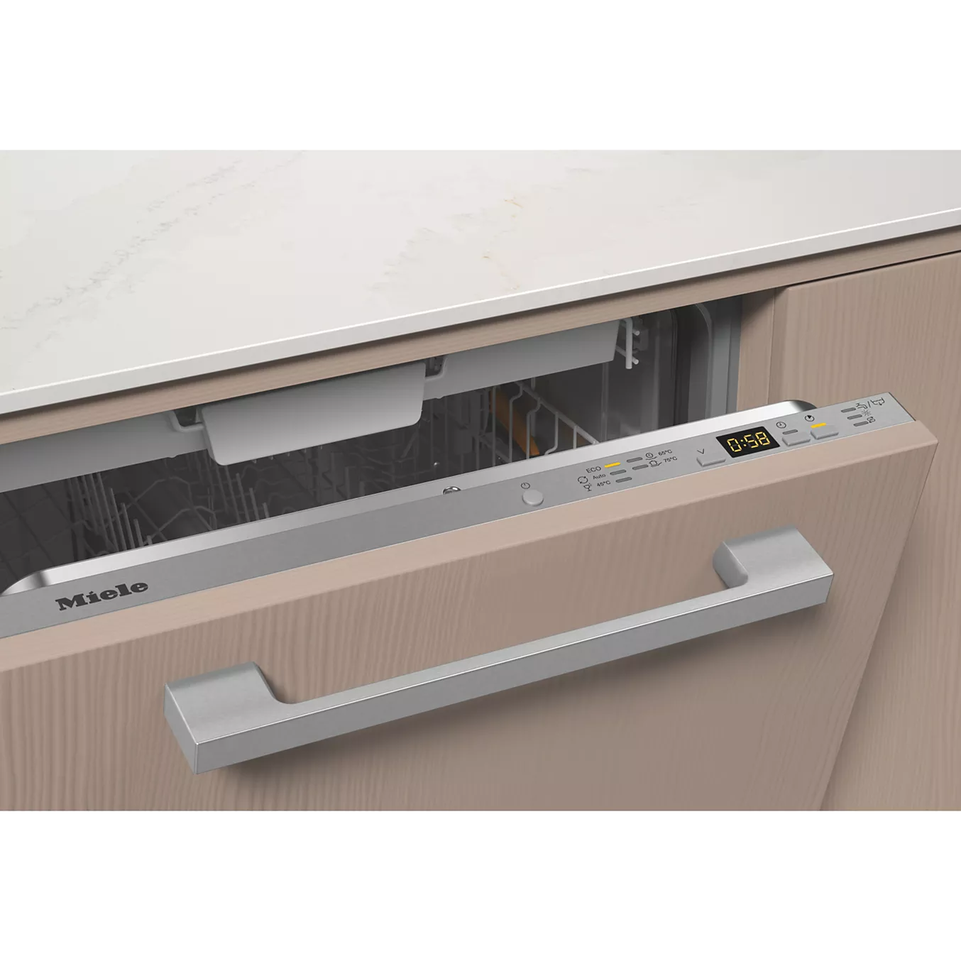 De Miele G 5656 SCVi XXL is een volledig integreerbare vaatwasser die perfect opgaat in je keuken dankzij het onzichtbare bedieningspaneel. Met een capaciteit van 14 couverts en een extra besteklade bovenaan biedt dit toestel veel laadruimte en flexibiliteit.