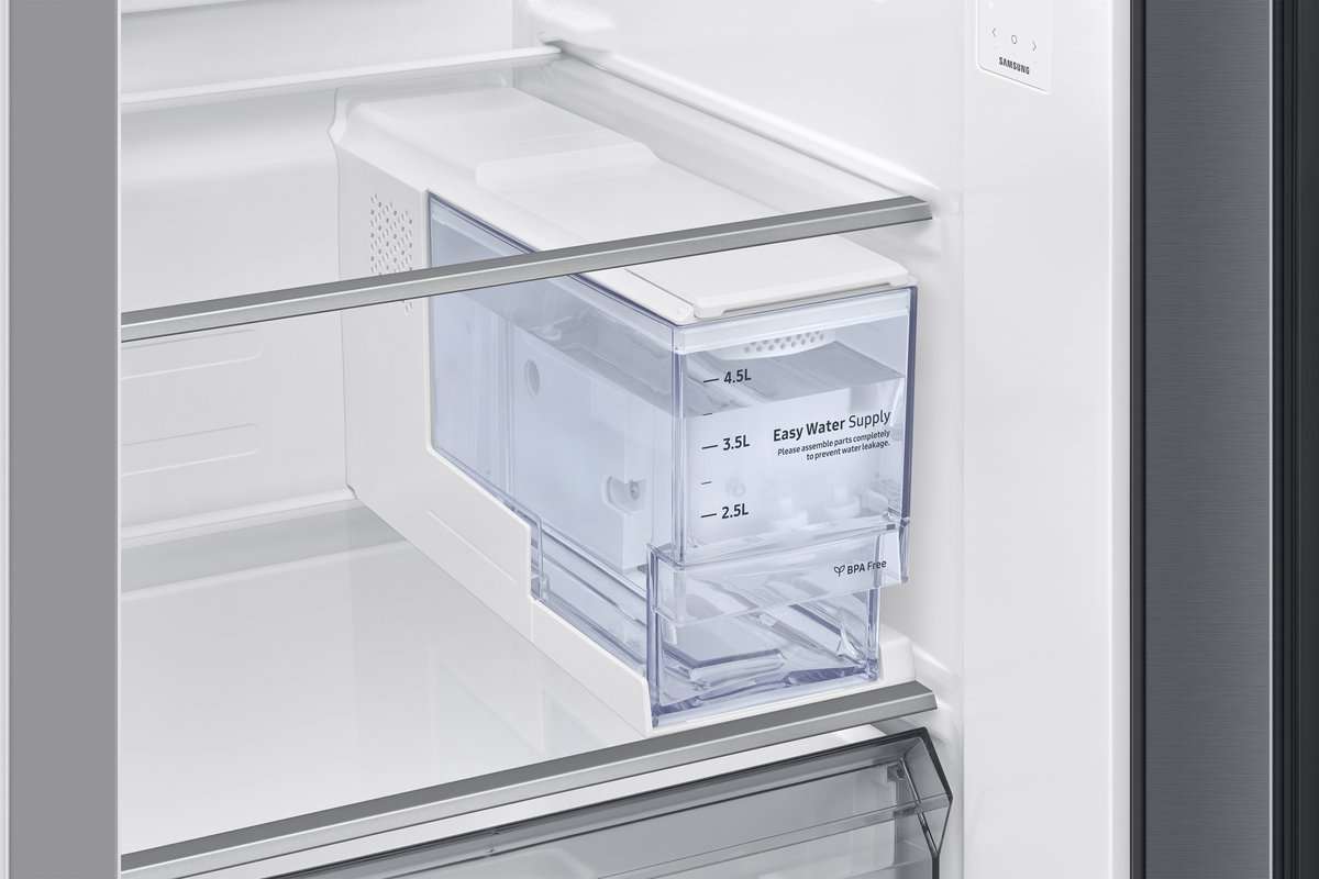 Installeer de koelkast overal zonder tijdrovende loodgieterswerkzaamheden of rommelige leidingen. De koelkast heeft een grote, BPA-vrije1 watertank van 4,5 liter voor de water- en ijsdispenser. Hij kan dus op bijna elke plek geïnstalleerd worden zonder aangesloten te worden op de waterleiding. Voeg gewoon mineraalwater of vers water toe en je kunt genieten van heerlijk gekoelde drankjes of ijs wanneer je maar wilt. En je hoeft de waterfilter niet regelmatig te vervangen, wat je tijd en moeite bespaart.