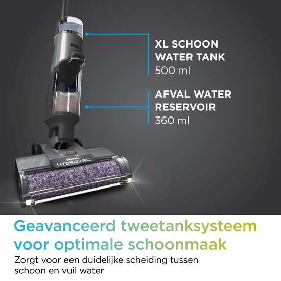De Shark Hydrovac WD210EU is een krachtige draadloze vloerreiniger die tegelijk stofzuigt en dweilt. Dankzij het dubbele waterreservoir wordt vuil water gescheiden van schoon water voor een optimaal reinigingsresultaat. Perfect voor harde vloeren en tapijten, en zeer geschikt voor huishoudens met huisdieren.