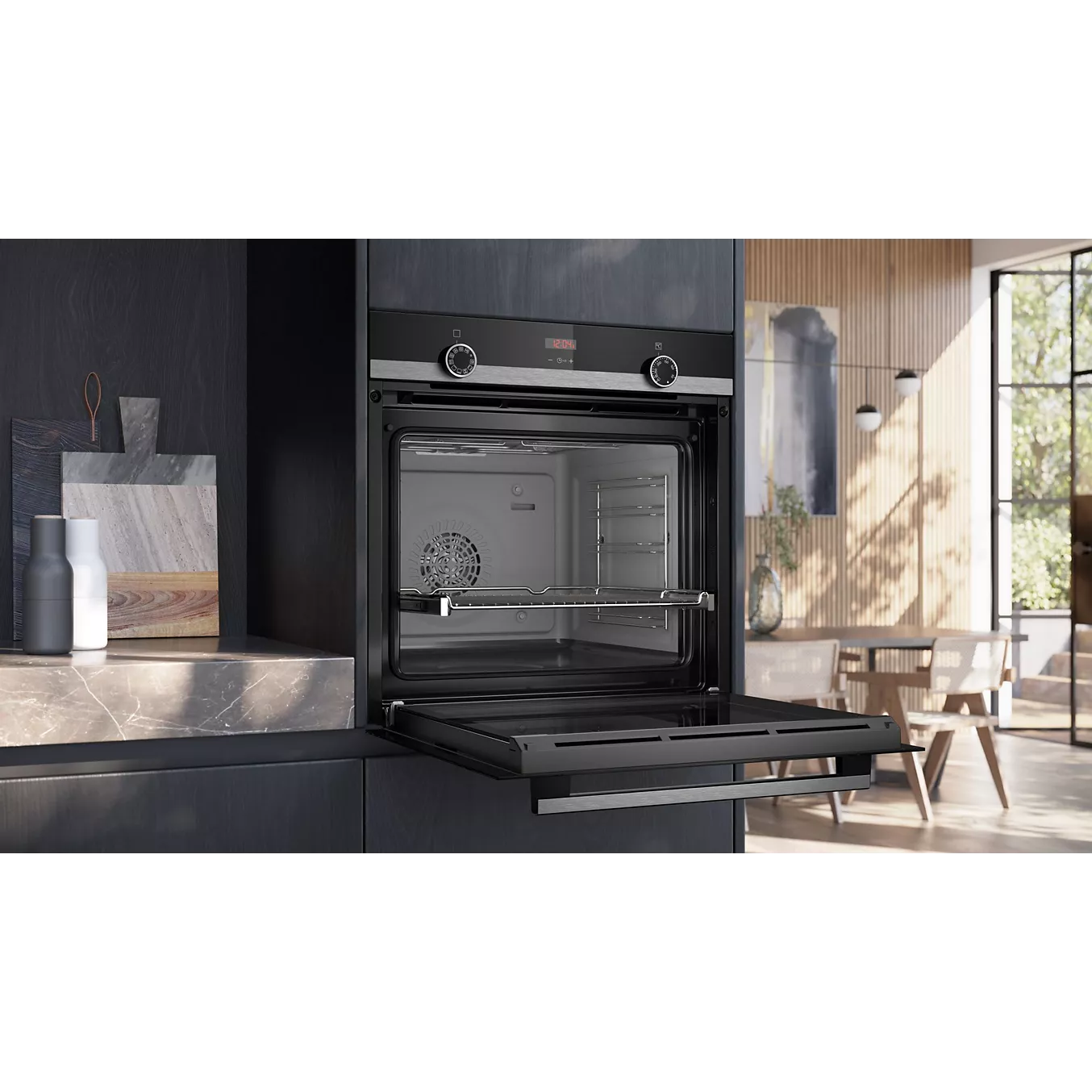 De oven is uitgerust met een ventilator en een ringweerstand aan de achterwand, waardoor meerdere gerechten gelijktijdig op verschillende niveaus kunnen worden bereid.