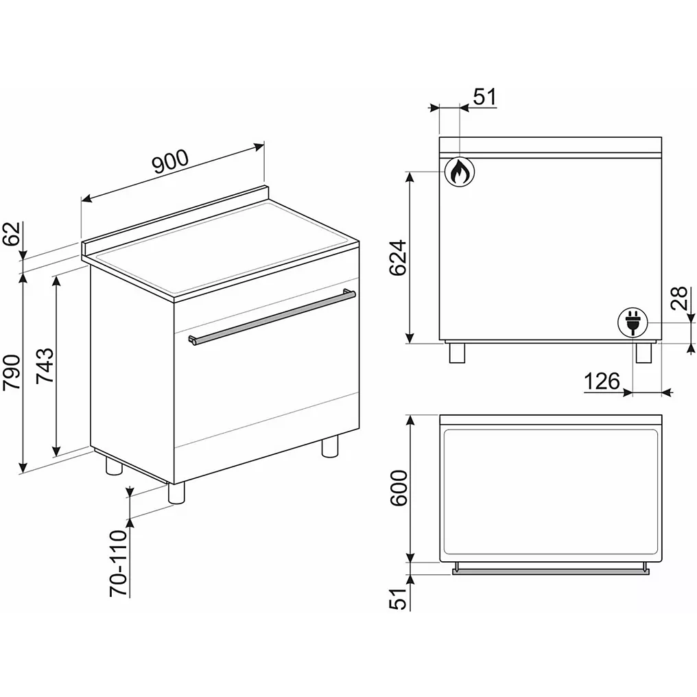 - Vereiste stroomsterkte: Het stroomcircuit van een fornuis is voorzien van een differentieelbeveiliging van het type 30 mA AC met een aparte stroomonderbreker van 20 A en eenfasebedrading met een doorsnede van 2,5 mm².